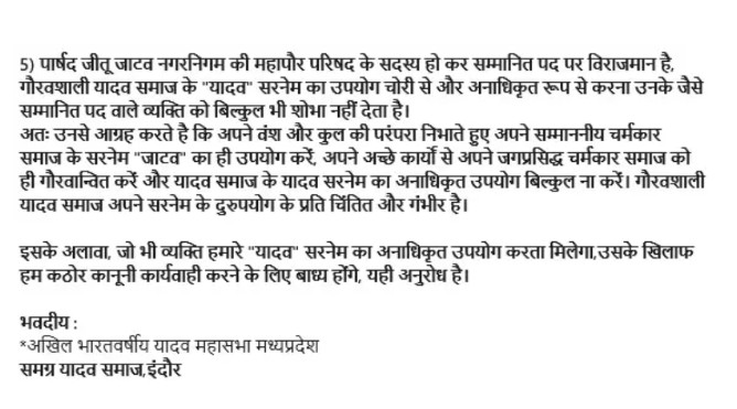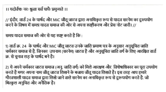 इस मामले में अखिल भारतवर्षीय यादव महासभा समेत इंदौर के यादव समाज से आने वाले कांग्रेस नेता राकेश यादव ने सीएम डॉ. मोहन यादव को एक पत्र भी लिखा है। उनका कहना है कि यादव सरनेम के दुरुपयोग से समाज बदनाम हो रहा है। राकेश यादव का कहना है कि मैंने मुख्यमंत्री जी को 170 लोगों की लिस्ट दी है।