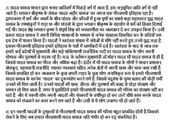 जिन्होंने यादव समाज की संस्थाओं से जातिगत सर्टिफिकेट लेकर कलेक्टर ऑफिस से जाति प्रमाण पत्र बनवाए हैं। जिसका ये लोग राजनीति, रिश्तेदारी, खेल समेत अन्य क्षेत्रों में दुरुपयोग कर रहे हैं। मेरी मांग है कि इन लोगों व प्रमाण-पत्र जारी करने वालों के खिलाफ एफआईआर दर्ज होना चाहिए।
