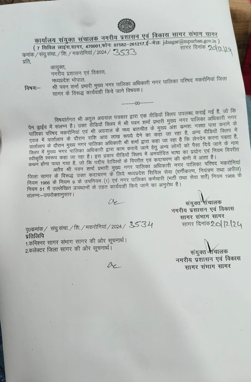 क्लिप में अमर्यादित भाषा का प्रयोग और नियम विपरीत कथन पाए गए हैं। जो पदीय दायित्वों के विपरीत व कदाचरण की श्रेणी में आता है। अतएव प्रभारी सीएमओ शर्मा के खिलाफ उक्त कदाचरण के लिए मप्र सिविल सेवा, वर्गीकरण, नियंत्रण एवं अपील के तहत कार्रवाई का अनुरोध किया जाता है।