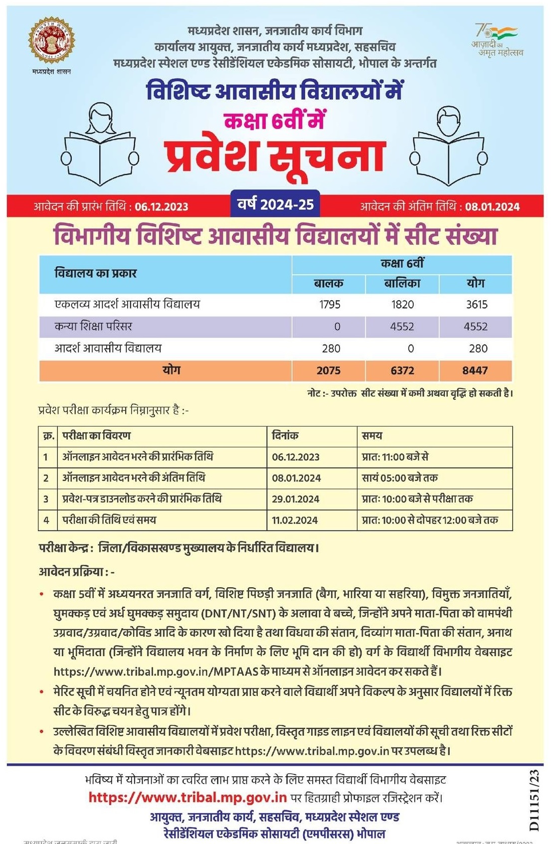 कार्यालय आयुक्त जनजातीय कार्य मप्र के अनुसार तीन केटेगरी के स्कूलों में पूरे प्रदेश में 8293 लड़के-लड़कियों को प्रवेश दिया जाएगा। इनमें से लड़कियों की सीट संख्या 6241 और लड़कों की 2052 है। बता दें कि कन्या शिक्षा परिसर केवल लड़कियों व आदर्श आवासीय विद्यालय में केवल लड़कों को प्रवेश दिया जाता है। जबकि एकलव्य आदर्श आवासीय विद्यालयों में लड़के-लड़कियों को प्रवेश दिया जाता है।