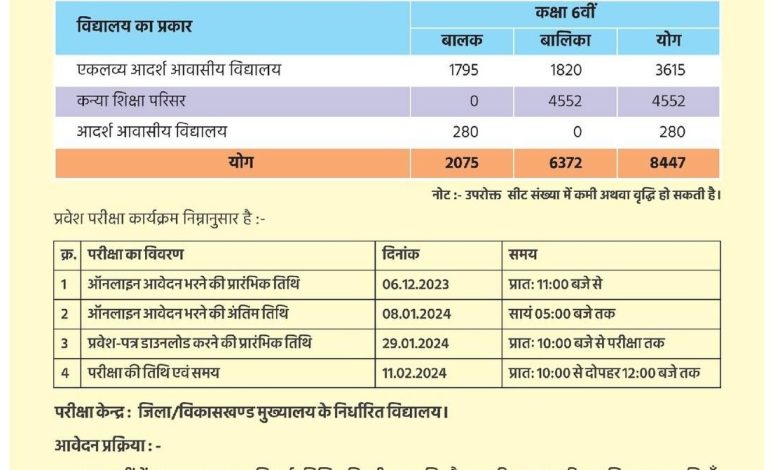 सागर। राज्य सरकार के जनजातीय कार्य विभाग के अधीनस्थ विशिष्ट आवासीय विद्यालयों में कक्षा 6वीं के लिए प्रवेश प्रक्रिया शुरु हो गई है। इन स्कूलों में मुख्य रूप से आदिवासी वर्ग, विमुक्त जनजातियों, घुमक्क्ड़ एवं अर्धघुमक्कड़ समुदाय के बच्चों को एडमिशन दिया जाना है।
