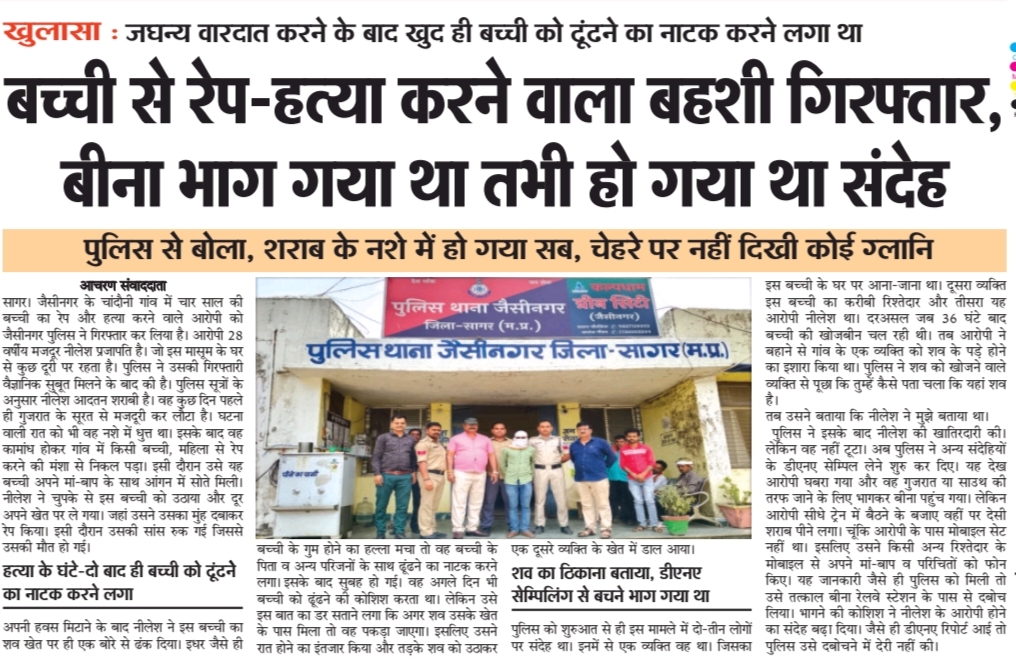 बच्ची से रेप-हत्या करने वाला बहशी गिरफ्तार, बीना भाग गया था तभी हो गया था संदेह