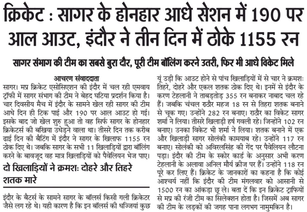 क्रिकेट : सागर के होनहार आधे सेशन में 190 पर आल आउट, इंदौर ने तीन दिन में ठोके 1155 रन