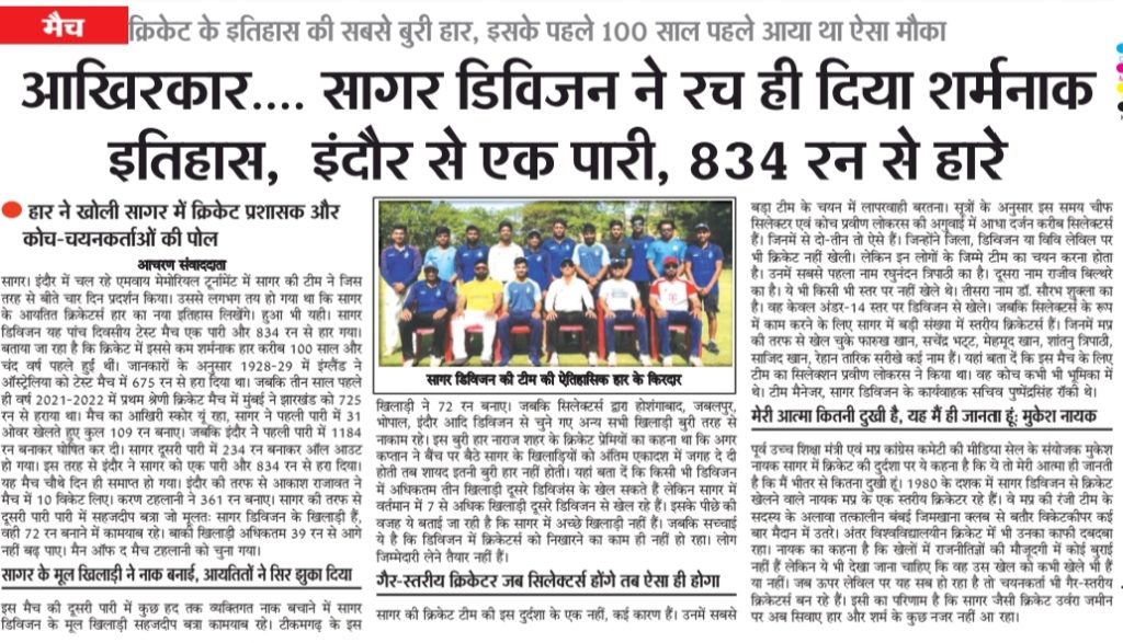 आखिरकार…. सागर डिविजन ने रच ही दिया शर्मनाक इतिहास, इंदौर से एक पारी, 834 रन से हारे