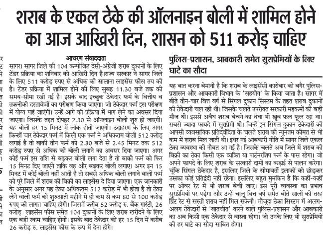 यह मानना नादानी है कि शराब के लाइसेंसी कारोबार को बगैर पुलिस-प्रशासन और आबकारी विभाग के ”सहयोग” के किया जाता है। सागर में बीते तीन-चार वित्त वर्ष से सिंगल दुकान सिस्टम के तहत शराब दुकानों की ठेकेदारी चल रही थी। जिसके चलते उपरोक्त सरकारी महकमों की बड़ी मौज थी। इससे अवैध शराब बेचने का धंधा भी खूब फल-फूल रहा था। सबसे ज्यादा फायदे में सुराप्रेमी थे। जिन्हें इन सिंगल दुकान ठेकेदारों की आपसी व्यवसायिक प्रतिद्वंदिता के चलते शराब की न्यूनतम कीमत से भी कम में शराब मिल जाती थी। लेकिन नई आबकारी नीति( 2025-26) में सागर जिले में एकल ठेका व्यवस्था की नौबत आ गई है। जिसके चलते