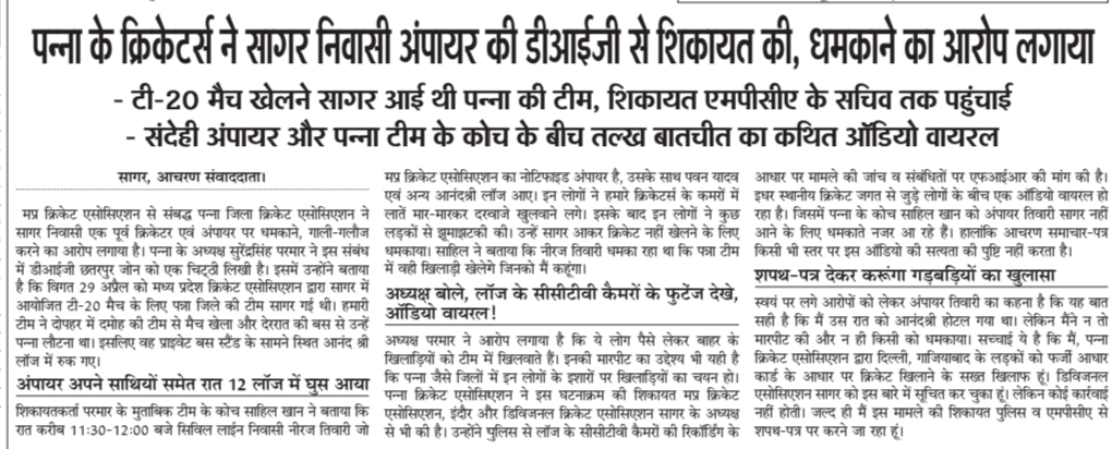 सागर। संभागीय क्रिकेट एसोसिएशन से संबद्ध पन्ना जिला क्रिकेट एसोसिएशन ने सागर निवासी एक पूर्व क्रिकेटर एवं अंपायर पर धमकाने, गाली-गलौज करने का आरोप लगाया है। पन्ना के अध्यक्ष सुरेंद्रसिंह परमार ने इस संबंध में डीआईजी छतरपुर जोन को एक चिट्ठी लिखी है। इसमें उन्होंने बताया है कि विगत 29 अप्रैल को मध्य प्रदेश क्रिकेट एसोसिएशन द्वारा सागर में आयोजित टी-20 मैच के लिए पन्ना जिले की टीम सागर गई थी। हमारी टीम ने दोपहर में दमोह की टीम से मैच खेला और देररात की बस से उन्हें पन्ना लौटना था। इसलिए वह प्राइवेट बस स्टैंड के सामने स्थित आनंद श्री लॉज में रुक गए।