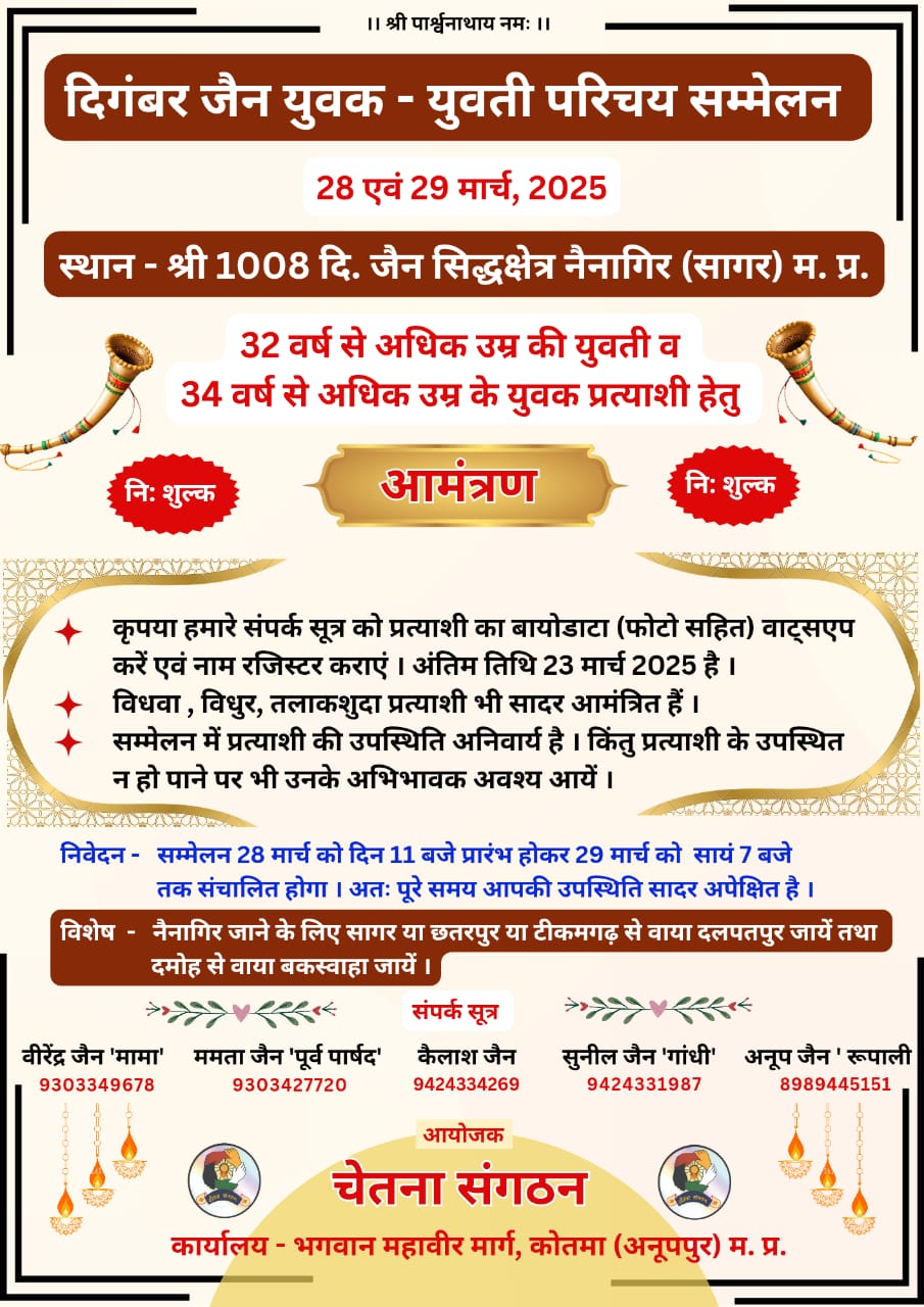 सागर। बंडा से करीब 20 किमी दूर जैन समाज का सिद्ध क्षेत्र नैनागिर है। जहां समाज द्वारा वैवाहिकी संबंधों के लिए एक नई पहल की जा रही है। यहां विवाह योग्य उम्रदराज युवक-युवतियों परिचय सम्मेलन किया जा रहा है। जो शुक्रवार-शनिवार को होगा। सम्मेलन में इन युवक-युवतियों के अलावा विधुर-विधवा व तलाकशुदा भी शामिल होंगे। यह आयोजन अनूपपुर जिले के चेतना संगठन ने किया है। सम्मेलन के लिए युवकों की उम्र 34 वर्ष से अधिक और युवती की 32 वर्ष से अधिक होना आवश्यक है। दावा किया जा रहा है कि अखिल भारतीय जैन समाज में पहली बार उम्रदराज युवक-युवतियों के लिए इस तरह का परिचय सम्मेलन आयोजित हो रहा है। सम्मेलन में करीब 1500 युवक और 600 युवतियों के पंजीयन हो चुके हैं।