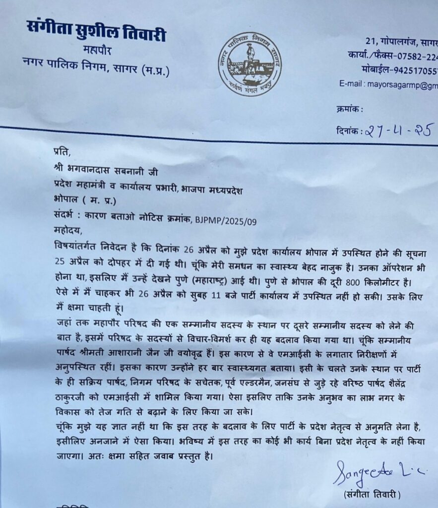 इसका कारण उन्होंने हर बार स्वास्थ्यगत बताया। इसी के चलते उनके स्थान पर पार्टी के ही सक्रिय पार्षद, निगम परिषद के सचेतक, पूर्व एल्डरमैन, जनसंघ से जुड़े रहे वरिष्ठ पार्षद शैलेंद्र ठाकुरजी को एमआईसी में शामिल किया गया। ऐसा इसलिए ताकि उनके अनुभव का लाभ नगर के अकास को तेज गति से बढ़ाने के लिए किया जा सके। चूंकि मुझे यह ज्ञात नहीं था कि इस तरह के बदलाव के लिए पार्टी के प्रदेश नेतृत्व से अनुमति लेना है, इसीलिए अनजाने में ऐसा किया। भविष्य में इस तरह का कोई भी कार्य बिना प्रदेश नेतृत्व के नहीं किया जाएगा। अतः क्षमा सहित जवाब प्रस्तुत है। – संगीता डॉ. सुशील तिवारी (महापौर)