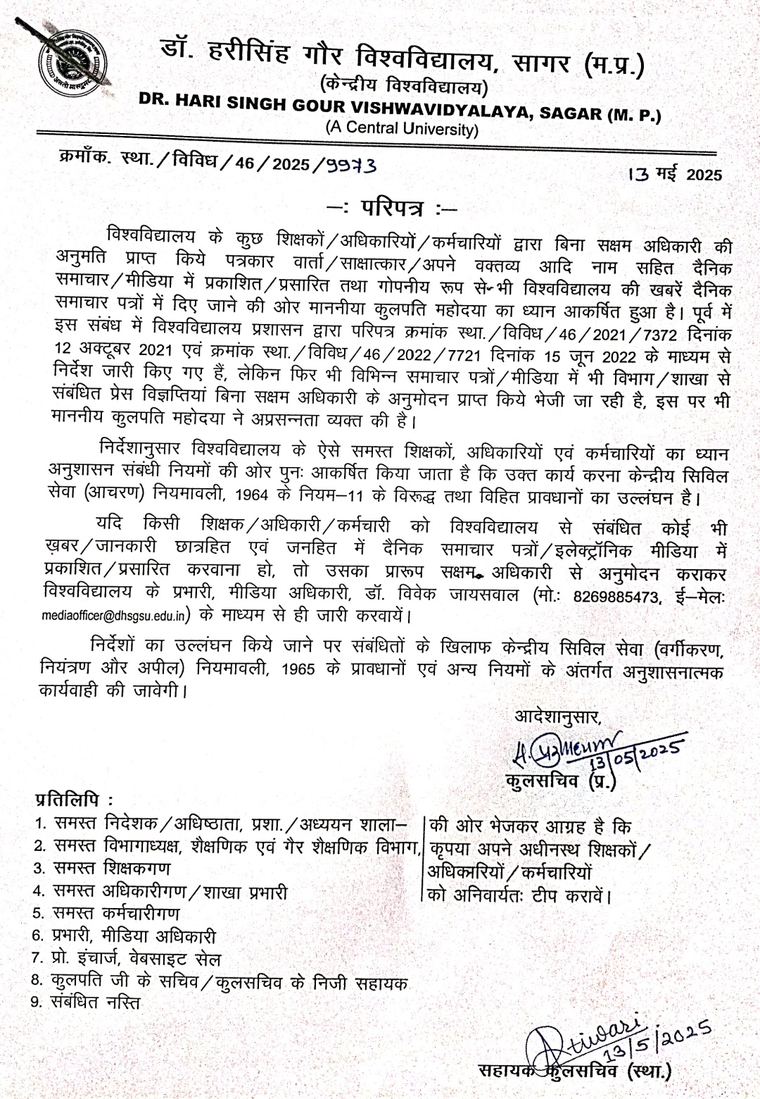 विवि में मीडिया सेंसरशिप! रजिस्ट्रार ने शिक्षकों, कर्मचारियों,अधिकारियों को चेताया