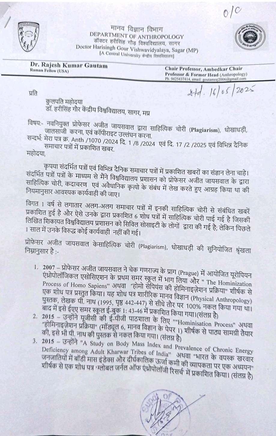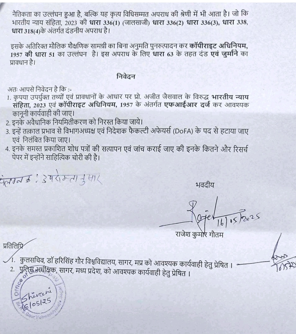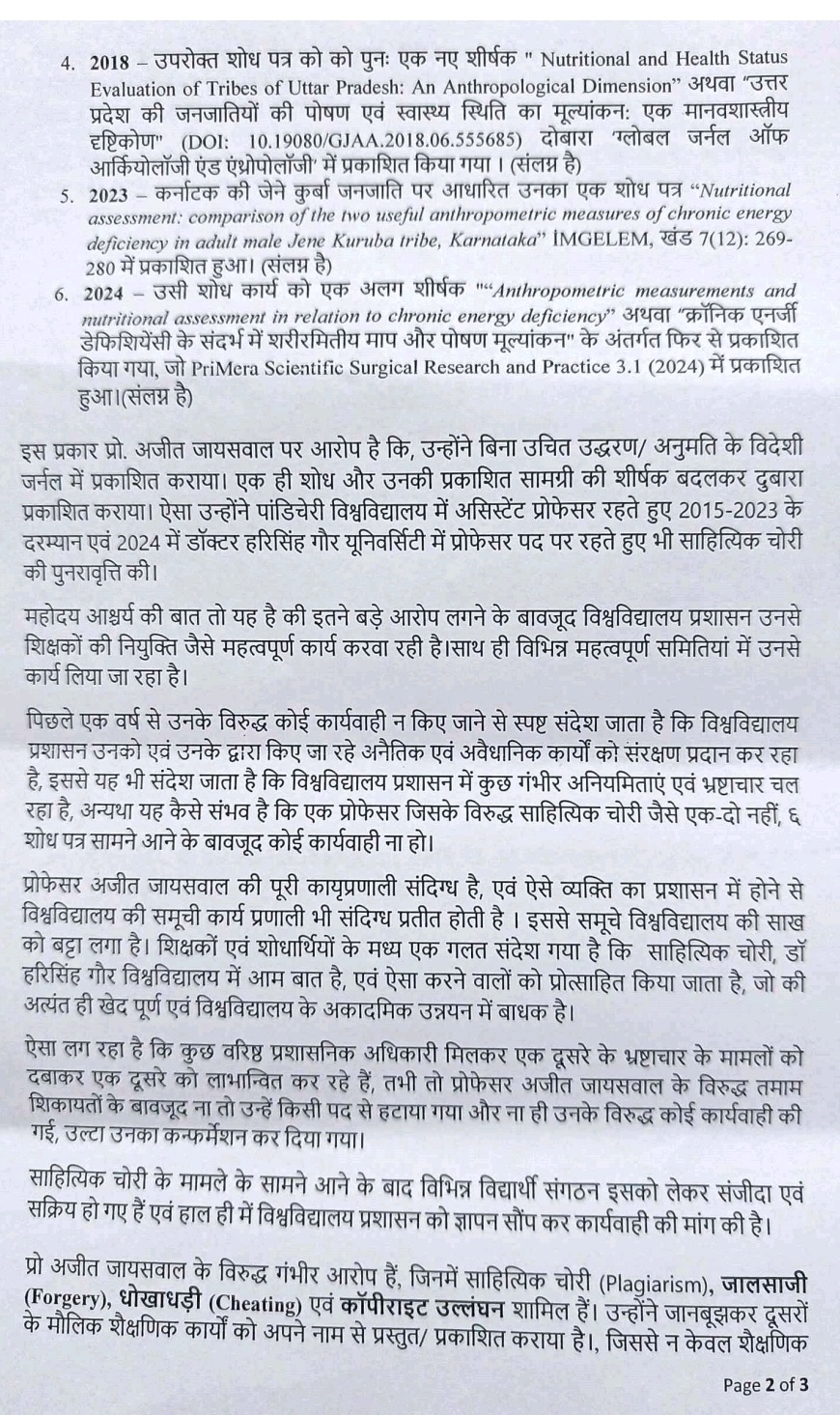 प्रो. गौतम ने ये शिकायती पत्र कुलपति डॉ. नीलिमा गुप्ता के अलावा प्रभारी रजिस्ट्रार समेत एसपी सागर को भी भेजा है। पत्र में प्रो. गौतम का मुख्य आरोप है कि, एचओडी प्रो. जायसवाल ने साहित्यिक चोरी (प्लेगेरिज्म) कर अपना शोध कार्य बिना उचित उद्धरण/अनुमति के विदेशी जर्नल में प्रकाशित कराया। एक ही शोध और प्रकाशित सामग्री का शीर्षक बदलकर दोबारा प्रकाशित कराया। ऐसा उन्होंने पांडिचेरी विश्वविद्यालय में असिस्टेंट प्रोफेसर रहते हुए 2015-2023 के दरम्यान एवं 2024 में डॉक्टर हरिसिंह गौर यूनिवर्सिटी में प्रोफेसर पद पर रहते हुए भी किया। प्रो. गौतम का कहना है कि प्रमाणत समेत शिकायत के बावजूद एक वर्ष से उनके विरुद्ध कोई कार्यवाही न किए जाने से स्पष्ट संदेश जाता है कि विश्वविद्यालय प्रशासन उनको एवं उनके द्वारा किए जा रहे अनैतिक एवं अवैधानिक कार्यों को संरक्षण प्रदान कर रहा है, इससे यह भी संदेश जाता है कि विश्वविद्यालय प्रशासन में कुछ गंभीर अनियमिताएं एवं भ्रष्टाचार चल रहा है, अन्यथा यह कैसे संभव है कि एक प्रोफेसर जिसके विरुद्ध साहित्यिक चोरी जैसे एक-दो नहीं, 6 शोध पत्र सामने आने के बावजूद कोई कार्यवाही ना हो। प्रोफेसर अजीत जायसवाल की पूरी कार्यप्रणाली संदिग्ध है एवं ऐसे व्यक्ति का प्रशासन में होने से विश्वविद्यालय की समूची कार्य प्रणाली भी संदेहास्पद हो गई है। समूचे विश्वविद्यालय की साख को बट्टा लगा है। शिक्षकों एवं शोधार्थियों के मध्य एक गलत संदेश गया है कि डॉ. हरीसिंह गौर विश्वविद्यालय में प्लेगेरिज्म आम बात है और यहां ऐसा करने वालों को प्रोत्साहित किया जाता है। जो की अत्यंत ही खेदपूर्ण एवं विश्वविद्यालय के अकादमिक उन्नयन में बाधक है। ये सब देख आखिर में ऐसा लग रहा है कि कुछ वरिष्ठ प्रशासनिक अधिकारियों की मंडली एक-दूसरे के भ्रष्टाचार व गड़बड़ियों को दबाकर आपसी बचाव कर रहे हैं। प्रोफेसर अजीत जायसवाल के विरुद्ध तमाम शिकायतों के बावजूद ना तो उन्हें किसी पद से हटाया गया और ना ही उनके विरुद्ध कोई कार्यवाही की गई, उल्टा उनका कन्फर्मेशन कर दिया गया। साहित्यिक चोरी के मामले के सामने आने के बाद विभिन्न विद्यार्थी संगठन इसको लेकर संजीदा एवं सक्रिय हो गए हैं एवं हाल ही में विश्वविद्यालय प्रशासन को ज्ञापन सौंप कर कार्यवाही की मांग की है। प्रो. अजीत जायसवाल के विरुद्ध गंभीर आरोपों में साहित्यिक चोरी (Plagiarism), जालसाजी (Forgery), धोखाधड़ी (Cheating) एवं कॉपीराइट उल्लंघन शामिल हैं। उन्होंने जानबूझकर दूसरों के मौलिक शैक्षणिक कार्यों को अपने नाम से प्रस्तुत/ प्रकाशित कराया है।, जिससे न केवल शैक्षणिक नैतिकता का उल्लंघन हुआ है, बल्कि यह कृत्य विधिसम्मत अपराध की श्रेणी में भी आता है। जो कि भारतीय न्याय संहिता, 2023 की ध