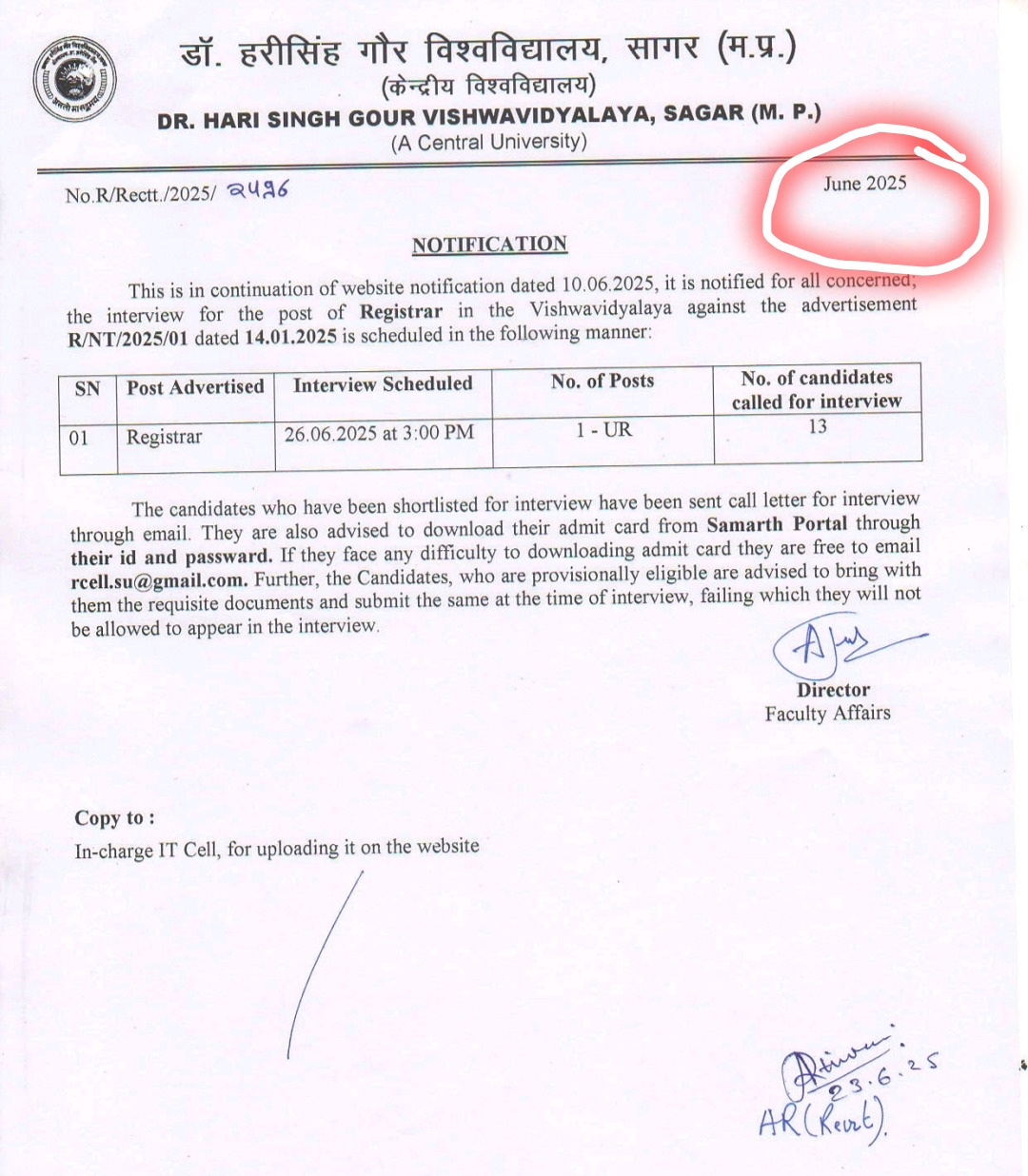 सागरवाणी इम्पैक्ट: विवि ने जारी किया रजिस्ट्रार पद के इंटरव्यू का नोटिफिकेशन, अब कुलपति पर आरोप