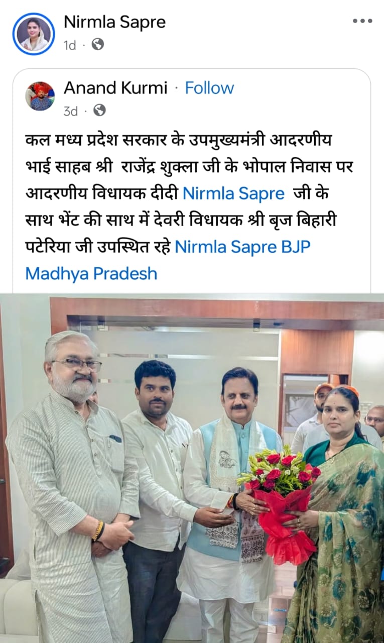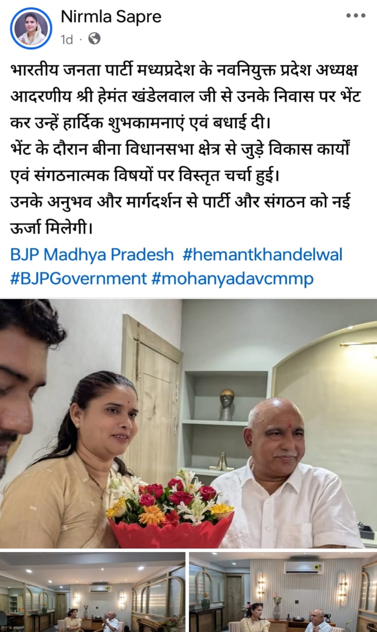 बीना क्षेत्र के सोशल मीडिया यूजर लिख रहे हैं कि माना कि विधायक जी तीन दिन से अस्पताल में भर्ती थीं। फिर उनके फेसबुक, X एकाउन्ट पर अपलोडेड फोटोज में भाजपा प्रदेशाध्यक्ष, डिप्टी सीएम, मंत्री समेत पार्टी पदाधिकारियों से कौन मिल रहा था। क्या वायरल ऑडियो की तरह ये फोटो भी Al के जरिए तैयार कराए गए हैं।