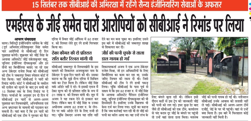 सागर। मिलिट्री इंजीनियरिंग सर्विस के जीई (दुर्ग अभियंता)नीतेशकुमार सिंह समेत चार आरोपियों से सीबीआई दो दिन पूछताछ करेगी। शुक्रवार को जीई सिंह के अलावा असिस्टेंट जीई राकेशकुमार साहू, जूनियर इंजीनियर दीपककुमार और इन तीनों का बिचौलिया बताए जा रहे एक अन्य ठेकेदार राजेश मिश्रा को सीबीआई की टीम ने जबलपुर स्थित स्पेशल कोर्ट में पेश किया।