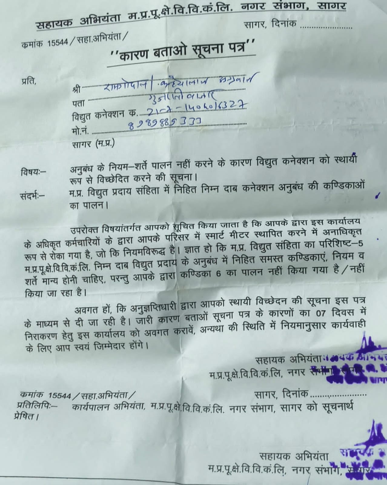 सागर। मध्य प्रदेश पूर्व क्षेत्र विद्युत वितरण कंपनी अब स्मार्ट मीटर लगाने के लिए सख्ती पर उतर आई है। ताज़ा मामला गुजराती बाजार के एक प्रतिष्ठित व्यवसायी का है, जहाँ मीटर बदलने से इनकार करने पर विभाग ने सीधे कनेक्शन काटने का ‘अंतिम नोटिस’ जारी कर दिया है।