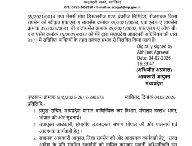 आबकारी आयुक्त अभिजीत अग्रवाल द्वारा जारी आदेश के अनुसार, सोम डिस्टलरीज की सेहतगंज और रोजराचक (रायसेन) स्थित इकाइयों के विरुद्ध मध्य प्रदेश आबकारी अधिनियम, 1915 की धारा 31(1) के तहत सख्त कार्रवाई की गई है। शासन ने कंपनी के डी-1 (डिस्टलरी), एफ.एल.-9 (मसाला शराब), सी.एस.-1 (देशी मदिरा) और बी-3 सहित कुल 15 से अधिक श्रेणी के लाइसेंस तत्काल प्रभाव से निलंबित कर दिए हैं। हालांकि कंपनी ने हाई कोर्ट की इंदौर खंडपीठ से सजा पर स्थगन लिया था, लेकिन महाधिवक्ता के विधिक अभिमत के बाद विभाग ने स्पष्ट किया कि ‘दोषसिद्धि’ अभी भी प्रभावी है, इसलिए लाइसेंस का संचालन जारी रखना कानूनन गलत है।