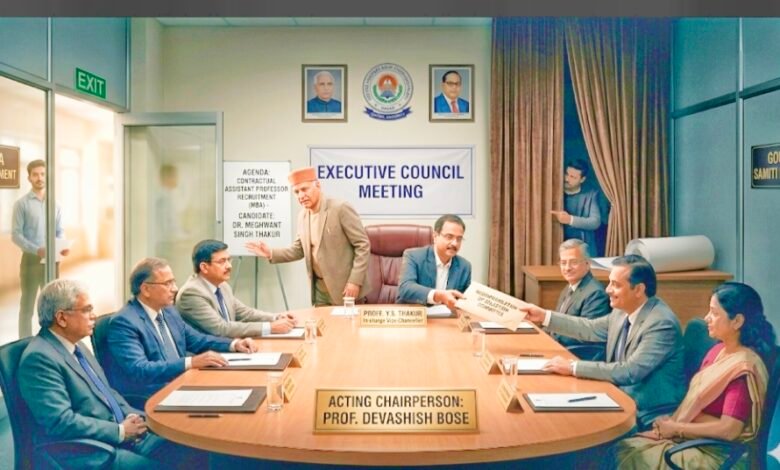 मिनिट्स के मुताबिक कार्यपरिषद की बैठक में जब सहायक प्राध्यापक (संविदा) की नियुक्तियों का एजेंडा आया, तो प्रभारी कुलपति प्रो. वाई.एस. ठाकुर ने अपने पुत्र डॉ. मेघवंत सिंह ठाकुर का नाम होने के कारण बैठक से बाहर जाकर नैतिकता की मिसाल पेश की! उनकी अनुपस्थिति में प्रो. देवाशीष बोस ने अध्यक्षता की और चयन समिति की उस सिफारिश को हरी झंडी दे दी, जिसमें कुलपति के सुपुत्र का चयन एमबीए विभाग के लिए किया गया था। हालांकि, विश्वविद्यालय के गलियारों में यह कटाक्ष आम है कि चयन प्रक्रिया के हर चरण में ‘पर्दे के पीछे’ की पटकथा पहले ही लिखी जा चुकी थी, जिसे प्रो. बोस व कार्यपरिषद ने केवल एक्ट बस किया है।