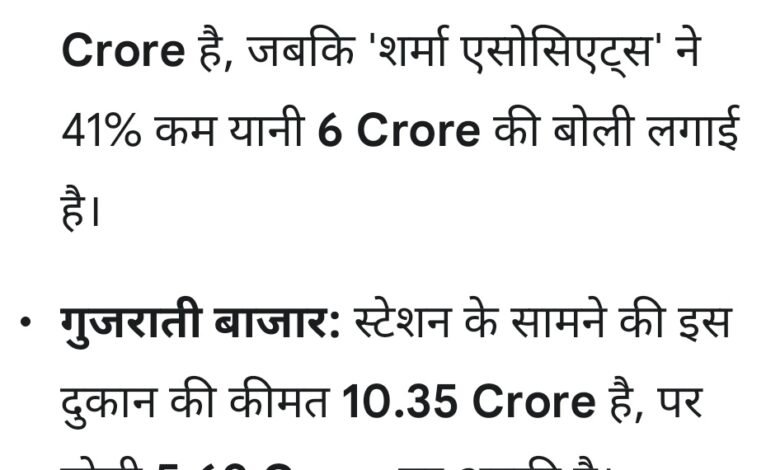 कर्रापुर: इस दुकान का आरक्षित मूल्य 10.35 करोड़ रुपये से अधिक है, लेकिन ठेकेदार समूह केएसआर इसे मात्र 1.99 करोड़ रु.(करीब 18%) में हासिल करना चाहता है। मधुकर शाह वार्ड: सरकारी कीमत 14.63 करोड़ रु. है, जबकि ‘शर्मा एसोसिएट्स’ ने 41% कम यानी 6 करोड़ रु. की बोली लगाई है। गुजराती बाजार: स्टेशन के सामने की इस दुकान की कीमत 10.35 करोड़ रु. है, पर बोली 5.69 करोड़ रु. पर अटकी है। जमुनिया: 9.13 करोड़ रु. की दुकान के लिए ठेकेदार जंडेलसिंह एंड कंपनी ने 5.11 करोड़ रु. की ही वैल्यू लगाई है। गढ़ाकोटा-1: इसकी सरकारी कीमत 8.43 करोड़ रु. है, जिसके बदले आरएस रिटेल्स ने 5.06 करोड़ रु. का ऑफर दिया है।