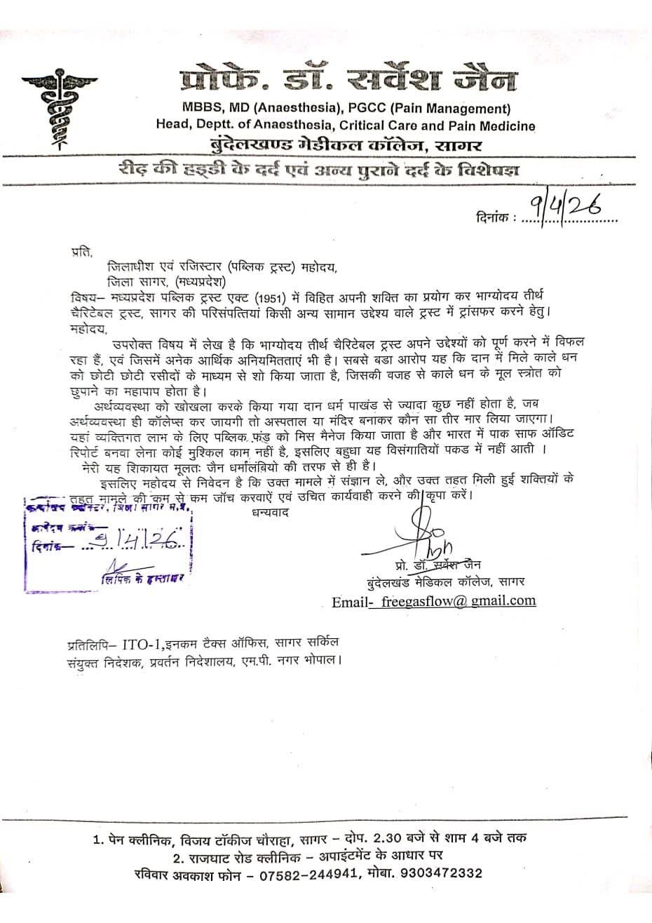 सागर। जिले में एक चिकित्सा विशेषज्ञ ने एक धार्मिक एवं बड़े चैरिटेबल ट्रस्ट के विरुद्ध मोर्चा खोल दिया है। बुंदेलखंड मेडिकल कॉलेज के एनेस्थीसिया विभागाध्यक्ष प्रो. डॉ. सर्वेश जैन ने ‘भाग्योदय तीर्थ चैरिटेबल ट्रस्ट’ पर वित्तीय अनियमितताओं और काला धन जमा करने के गंभीर आरोप लगाते हुए जिला कलेक्टर को शिकायती पत्र सौंपा है। उन्होंने इस शिकायत की प्रति इनकम टैक्स विभाग और प्रवर्तन निदेशालय को भी भेजी है, ताकि ट्रस्ट के वित्तीय लेन-देन की उच्च स्तरीय जांच हो सके। यहां बता दें कि शिकायतकर्ता डॉ. सर्वेश जैन का इस संस्थान से पुराना नाता रहा है; उनकी वे स्वयं और पत्नी भाग्योदय अस्पताल में लंबे समय तक डॉक्टर के रूप में सेवाएं दे चुके हैं। इसी पृष्ठभूमि के आधार पर डॉ. जैन का दावा है कि उन्होंने संस्थान की कार्यप्रणाली को बहुत करीब से देखा है। उन्होंने अपने शिकायती पत्र में तीखा हमला करते हुए कहा कि ट्रस्ट अपने निर्धारित उद्देश्यों में विफल रहा है और यहाँ दान में मिले काले धन को छोटी-छोटी रसीदों के जरिए खपाया जा रहा है, जो कि ‘महापाप’ की श्रेणी में आता है। उन्होंने ऑडिट रिपोर्ट्स पर भी सवाल उठाते हुए कहा कि रसूख के दम पर ‘साफ-सुथरी’ रिपोर्ट बनवा लेना आसान है, जिससे असल विसंगतियां छिप जाती हैं। डॉ. जैन ने कलेक्टर से मांग की है कि ‘मध्य प्रदेश पब्लिक ट्रस्ट एक्ट (1951)’ के तहत शक्तियों का प्रयोग कर इस ट्रस्ट की संपत्तियों को किसी अन्य पारदर्शी ट्रस्ट में स्थानांतरित किया जाए।