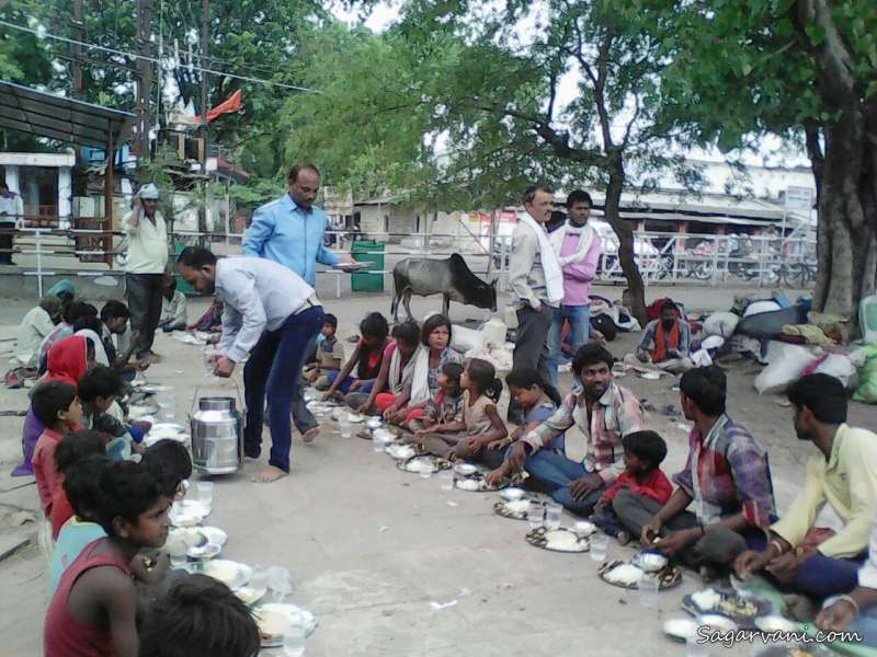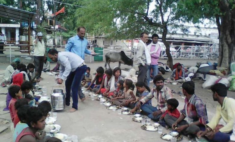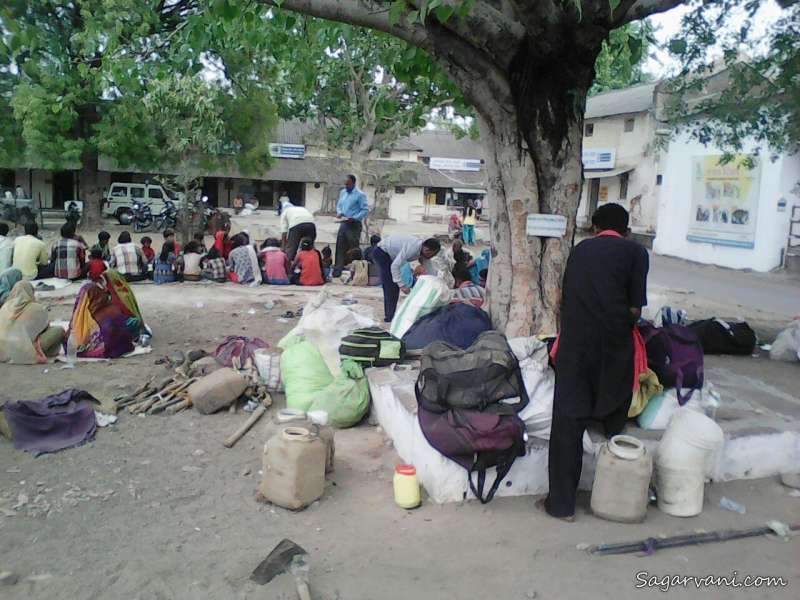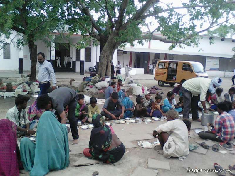 परिवारों के महिलाएं बच्चे सब मिलाएं तो पूरा जत्था लगभग सौ लोगों का है। सुबह आठ बजे से दिन भर की धूप सिर पर से गुजर गई तब दोपहर दो बजे प्रशासन की पहल पर श्रीसीताराम रसोई नामक धर्मार्थ संस्था से इनके लिए भोजन का इंतजाम किया गया। न फर्श न दरी, सीधे धूल भरे मैदान में ही कागज की थालियों में इनका भोजन हुआ।