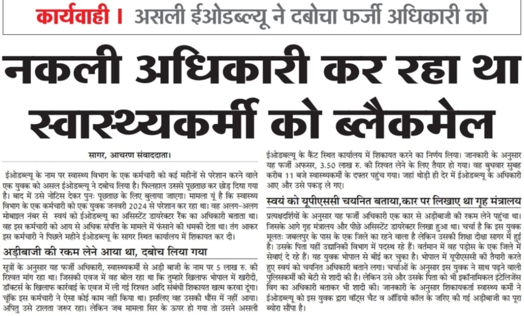 sagarvani.com9425172417. सागर। ईओडब्ल्यू के नाम पर स्वास्थ्य विभाग के एक कर्मचारी को कई महीनों से ब्लैकमेल करने की कोशिश में लगे एक युवक को असल ईओडब्ल्यू ने दबोच लिया। फिलहाल उससे पूछताछ कर छोड़ दिया गया है। बाद में उसे नोटिस देकर पुन: पूछताछ के लिए बुलाया जाएगा। मामला यूं है कि स्वास्थ्य विभाग के एक कर्मचारी को एक युवक जनवरी 2024 से ब्लैकमेल कर रहा था।
