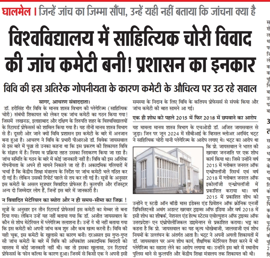 sagarvani.com9425172417. सागर। डॉ. हरीसिंह गौर विवि के मानव शास्त्र विभाग की प्लेगेरिज्म (साहित्यिक चोरी) संबंधी शिकायत को लेकर एक जांच कमेटी का गठन किया गया! जिसमें लखनऊ, इलाहाबाद और दक्षिण भारत के तिरूपति शहर के विश्वविद्यालय के रिटायर्ड प्रोफेसर्स को शामिल किया गया है। यह तीनों मानव शास्त्र विभाग से हैं। दूसरी ओर जाने क्यों विवि प्रशासन इस कमेटी के बारे में अनजान बना हुआ है। सागरवाणी डॉट कॉम ने विवि के प्रभारी पीआरओ डॉ. विवेक जायसवाल से इस बारे में पूछा तो उनका कहना था कि इस प्रकरण की शिकायत विवि के संज्ञान में है। नियम व प्रक्रिया तहत उसका निराकरण किया जा रहा है। जांच समिति के गठन के बारे में
