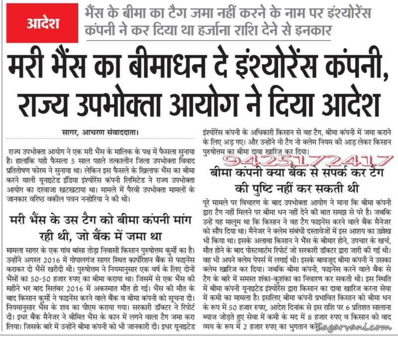 राज्य उपभोक्ता आयोग ने एक मरी भैंस के मालिक के पक्ष में फैसला सुनाया है। हालांकि यही फैसला 5 साल पहले तत्कालीन जिला उपभोक्ता विवाद प्रतितोषण फोरम ने सुनाया था। लेकिन इस फैसले के खिलाफ भैंस का बीमा करने वाली यूनाइटेड इंडिया इंश्योरेंस कंपनी लिमिटेड ने राज्य उपभोक्ता आयोग का दरवाजा खटखटाया था। मामले में पैरवी उपभोक्ता मामलों के जानकार वरिष्ठ वकील पवन नन्होरिया ने की थी।