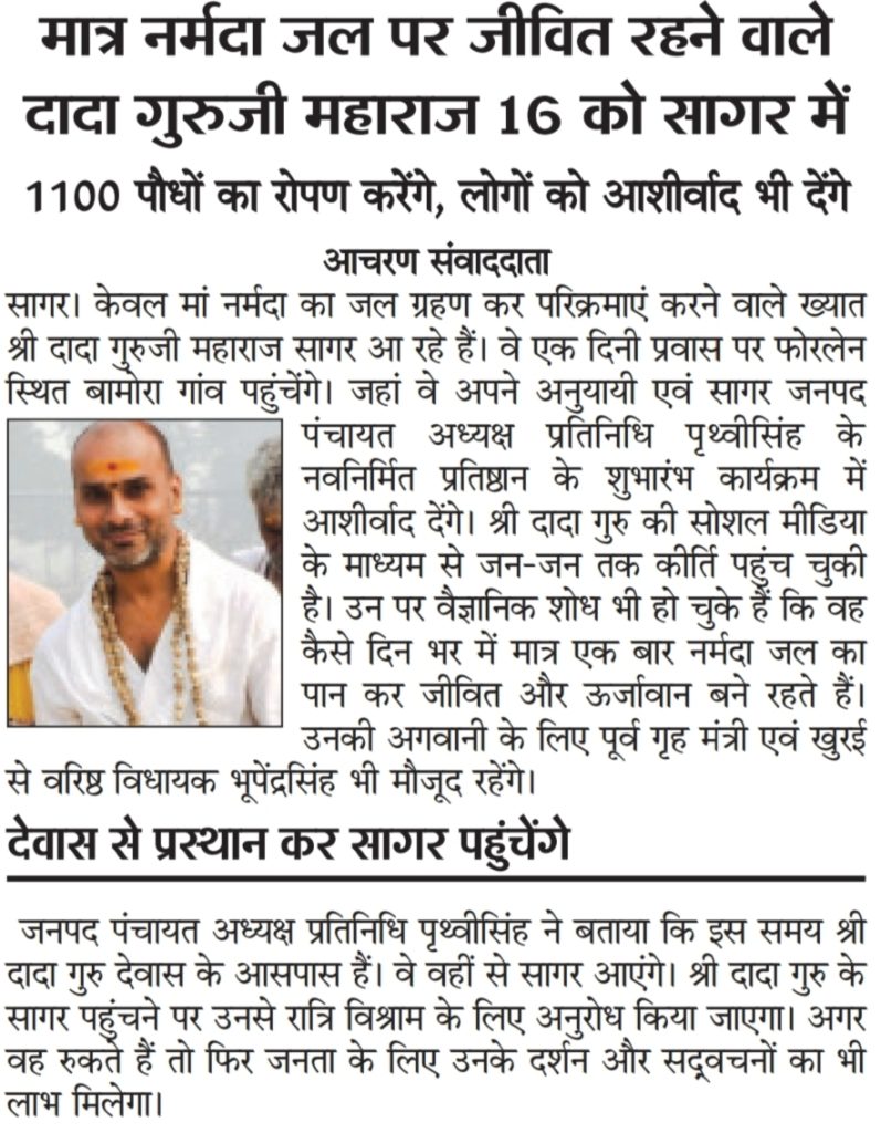 मात्र नर्मदा जल पर जीवित रहने वाले दादा गुरुजी महाराज 16 को सागर में