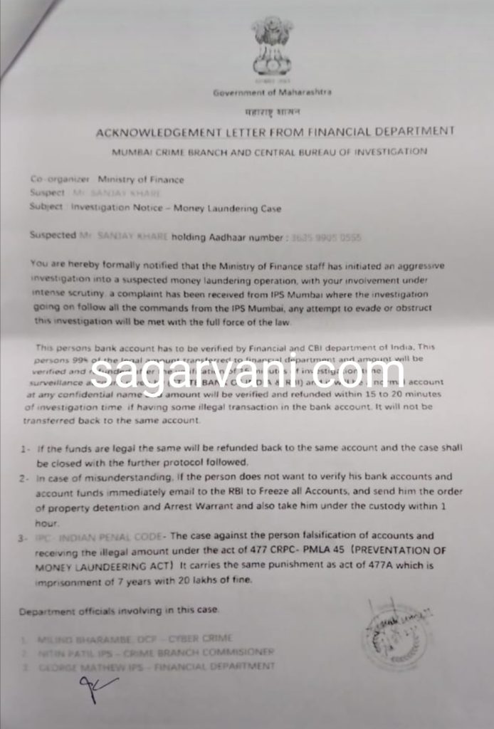 आपको औपचारिक रूप से सूचित किया जाता है कि वित्त मंत्रालय के कर्मचारियों ने एक संदिग्ध मनी लॉन्ड्रिंग ऑपरेशन की त्वरित जांच शुरू की है, जिसमें आपकी संलिप्तता गहन जांच के दायरे में है, आईपीएस मुंबई से एक शिकायत प्राप्त हुई है। जो आईपीएस मुंबई के सभी आदेशों का पालन करते हुए जांच चल रही है। इस जांच से बचने या बाधा डालने के किसी भी प्रयास का कानून की पूरी सख्ती से निपटारा किया जाएगा।