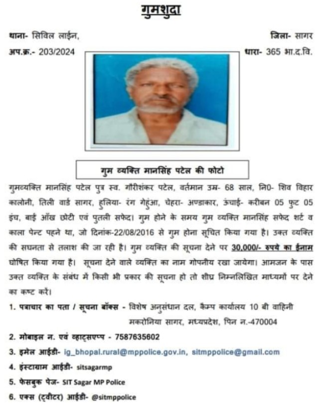 सागर। 8 साल से लापता तिली वार्ड निवासी किसान मानसिंह पटेल की तलाश के लिए SIT ने 30 हजार रु. का इनाम घोषित किया है। एसआईटी द्वारा जारी पोस्टर के अनुसार मानसिंह पटेल 22 अगस्त 2016 से लापता हैं। पोस्टर में मानसिंह के हुलिए के अलावा उनके द्वारा पहने गए कपड़ों का ब्योरा भी है।