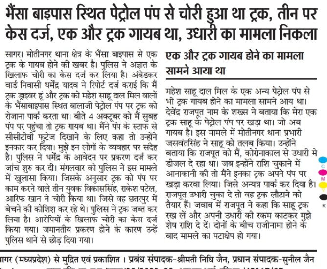 जो अब गायब है। इस मामले में मोतीनगर थाना प्रभारी जसवंतसिंह ने साहू को तलब किया। उन्होंने बताया कि राजपूत को मैं, कोरोनाकाल से उधारी मे डीजल दे रहा था। जब इन्होंने राशि चुकाने में आनाकानी की तो मैंने इनका ट्रक अपने पंप पर खड़ा करवा लिया। जिसे अन्यत्र पार्क कर दिया है। राजपूत उधारी चुका दे तो वह ट्रक लौटाने तैयार हैं। जवाब में राजपूत ने कहा कि साहू ट्रक रख लें और अपनी उधारी की रकम काटकर मुझे शेष राशि दे दें। दोनों के बीच राजीनामा होने के बाद मामले का पटाक्षेप हो गया।