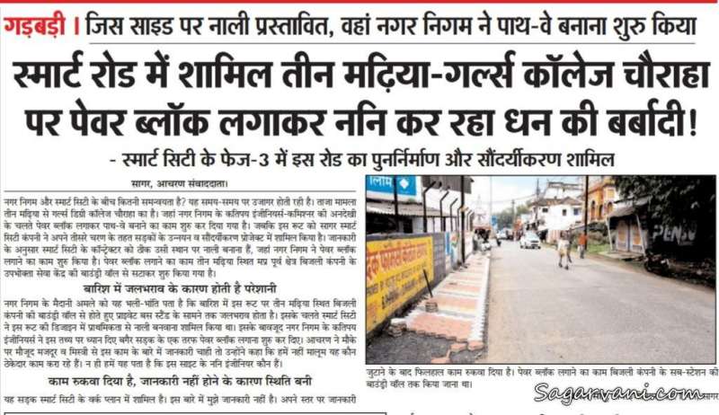 नगर निगम के मैदानी अमले को यह भली-भांति पता है कि बारिश में इस रूट पर तीन मढ़िया स्थित बिजली कंपनी की बाउंड्री वॉल से होते हुए प्राइवेट बस स्टैंड के सामने तक जल भराव होता है। इसके चलते स्मार्ट सिटी ने इस रूट की डिजाइन में प्राथमिकता से नाली बनवाना शामिल किया था। इसके बावजूद नगर निगम के कतिपय इंजीनियर्स ने इस तथ्य पर ध्यान दिए बगैर सड़क के एक तरफ पेवर ब्लॉक लगाना शुरु कर दिए। मौके पर मौजूद मजदूर व मिस्त्री से इस काम के बारे में जानकारी चाही तो उन्होंने कहा कि हमें नहीं मालूम यह कौन ठेकेदार काम करा रहे हैं। न ही हमें यह पता है कि इस साइट के ननि इंजीनियर कौन हैं।