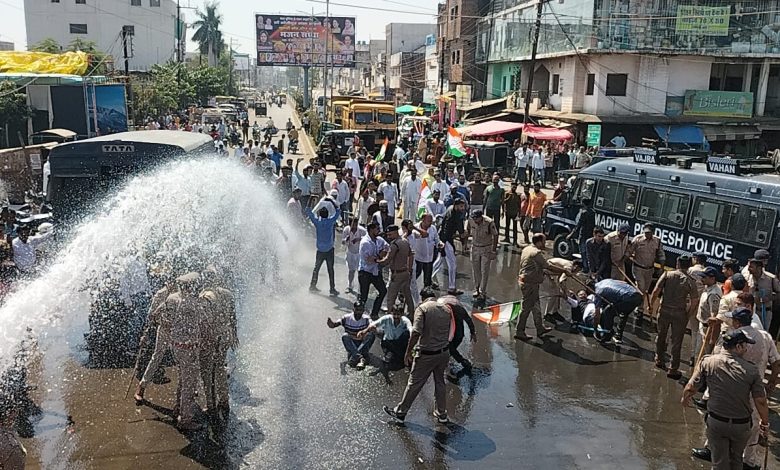 विधायक निर्मला को गुलदस्ता देने पहुंचे थेे कांग्रेसी, पुलिस ने पानी की बौछारें मारकर रोका, जाते-जाते लगाए मुर्दाबाद के नारे
