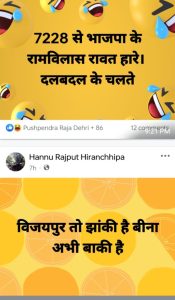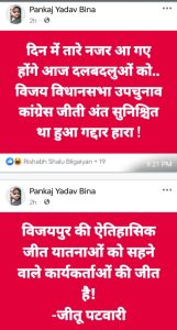 वरना जिस सीट पर इतनी प्रचंड जीत मिली हो। वहां उसकी पार्टी के प्रत्याशी को महज 13 हजार से अधिक मतों की जीत को क्या माना जाना चाहिए। इन परिणामों को लेकर बीना के कांग्रेसियों के सोशल मीडिया एकाउंट पर घुमा फिराकर तंज कसे जा रहे हैं। बता दें कि बीना की विधायक निर्मला सप्रे लोकसभा चुनाव से लेकर अब तक भाजपा के मंचों पर दिख रहीं हैं। जबकि उन्होंने आधिकारिक रूप से कांग्रेस से इस्तीफा नहीं दिया है और न ही भाजपा ज्वाइन की है।