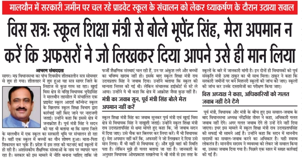 सागर। मप्र विधानसभा का पांच दिवसीय शीतकालीन सत्र सोमवार से शुरु हो गया। शीतलहर में शुरु हुआ यह सत्र सागर जिले के लिहाज से कुछ गरम सा रहा। खुरई विस क्षेत्र से वरिष्ठ विधायक भूपेंद्रसिंह ने मालथौन तहसील में संचालित एक प्राइवेट स्कूल आदर्श कॉन्वेन्ट स्कूल के खिलाफ स्कूल शिक्षा विभाग द्वारा कार्रवाई नहीं किए जाने पर नाराजगी जताई। उन्होंने कहा कि इससे क्षेत्र में जनाक्रोश है। पूर्व मंत्री सिंह ने सदन को यह भी बताया था कि सागर जिले के मालथौन में एक स्कूल का सरकारी भूमि पर संचालन हो रहा है। वहीं एक स्कूल में बच्चों का यौन शोषण हुआ। माता-पिता शिकायत कर चुके हैं। प्रदेश में इस तरह की घटनाएं कई स्कूलों में हो रही है।