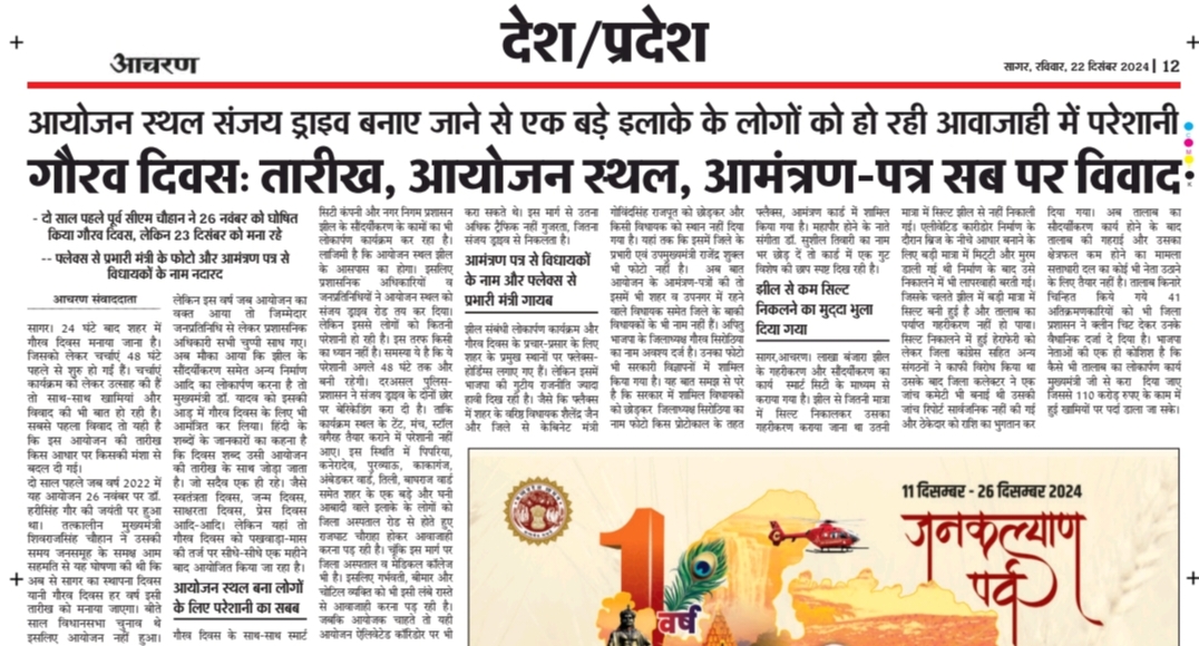 सागर। 24 घंटे बाद शहर में गौरव दिवस मनाया जाना है। जिसको लेकर चर्चाएं 48 घंटे पहले से शुरु हो गईं हैं। चर्चाएं कार्यक्रम को लेकर उत्साह की हैं तो साथ-साथ खामियां और विवाद की भी हैं। सबसे पहला विवाद तो यही है कि इस आयोजन की तारीख किस आधार पर और किसकी मंशा से बदल दी गई। दो साल पहले जब वर्ष 2022 में यह आयोजन 26 नवंबर पर डॉ. हरीसिंह गौर की जयंती पर हुआ था। तत्कालीन मुख्यमंत्री शिवराजसिंह चौहान ने उसी समय जनसमूह के समक्ष आम सहमति से यह घोषणा की थी कि अब से सागर का स्थापना दिवस यानी गौरव दिवस हर वर्ष इसी तारीख को मनाया जाएगा। बीते साल विधानसभा चुनाव थे इसलिए आयोजन नहीं हुआ। लेकिन इस वर्ष जब आयोजन का वक्त आया तो जिम्मेदार जनप्रतिनिधि से लेकर प्रशासनिक अधिकारी सभी चुप्पी साध गए। झील के सौंदर्यीकरण समेत अन्य निर्माण आदि का लोकार्पण करना है तो मुख्यमंत्री डॉ. यादव को इसकी आड़ में गौरव दिवस के लिए भी आमंत्रित कर लिया। हिंदी शब्दों के जानकारों का कहना है कि दिवस शब्द उसी आयोजन की तारीख के साथ जोड़ा जाता है। जो सदैव एक ही रहे। जैसे स्वतंत्रता दिवस, जन्म दिवस, साक्षरता दिवस, प्रेस दिवस आदि-आदि। लेकिन यहां तो गौरव दिवस को पखवाड़ा-मास की तर्ज पर सीधे-सीधे एक महीने बाद आयोजित किया जा रहा है।