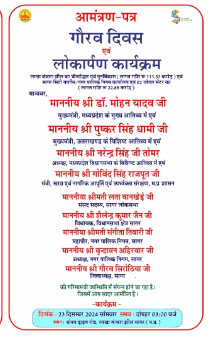 नगर पालिका निगम सागर एवं सागर स्मार्ट सिटी लिमिटेड द्वारा गौरव दिवस एवं लोकार्पण कार्यक्रम का आयोजन किया जा रहा है। 23 दिसंबर दोपहर 3 बजे मुख्यमंत्री डॉ. मोहन यादव लाखा बंजारा झील का जीर्णोद्धार एवं पुर्नविकास एवं सागर सिटी गवर्नेंस नगर पालिका निगम कार्यालय एवं दो जोनल सेंटर का लोकार्पण करेंगे। मुख्य अतिथि के रूप में उत्तराखंड के मुख्यमंत्री श्री पुष्कर धामी एवं विशिष्ट अतिथि मध्य प्रदेश विधानसभा अध्यक्ष नरेंद्र सिंह तोमर, नागरिक एवं आपूर्ति उपभोक्ता संरक्षण मंत्री गोविंद सिंह राजपूत, सांसद लता वानखेड़े, विधायक शैलेंद्र जैन, नगर पालिका निगम महापौर संगीता तिवारी, नगर पालिका निगम अध्यक्ष वृंदावन अहिरवार, भाजपा के जिलाध्यक्ष गौरव सिरोठिया शामिल होंगे।